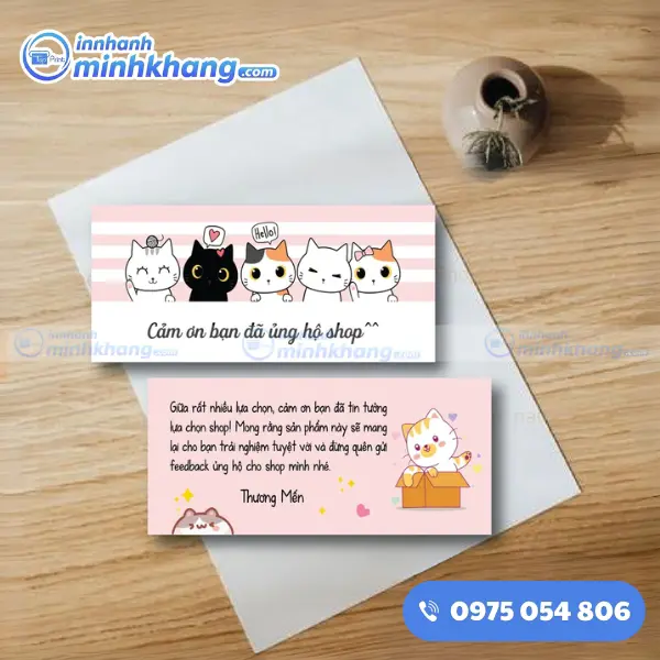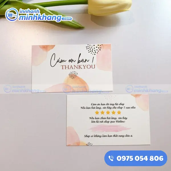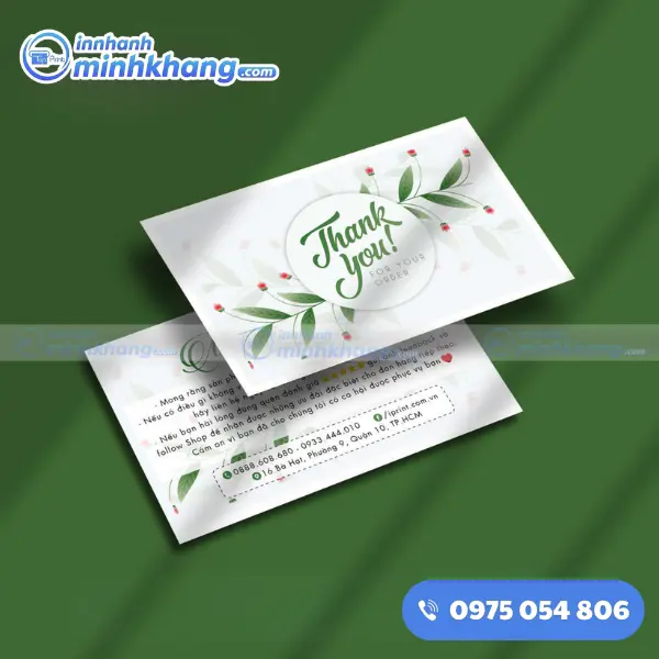 Với phương châm đặt sự hài lòng của khách hàng lên hàng đầu, In Nhanh Minh Khang cam kết mỗi tấm card cảm ơn xuất xưởng đều là một sản phẩm hoàn hảo, giúp bạn chinh phục niềm tin của người mua ngay từ cái nhìn đầu tiên.