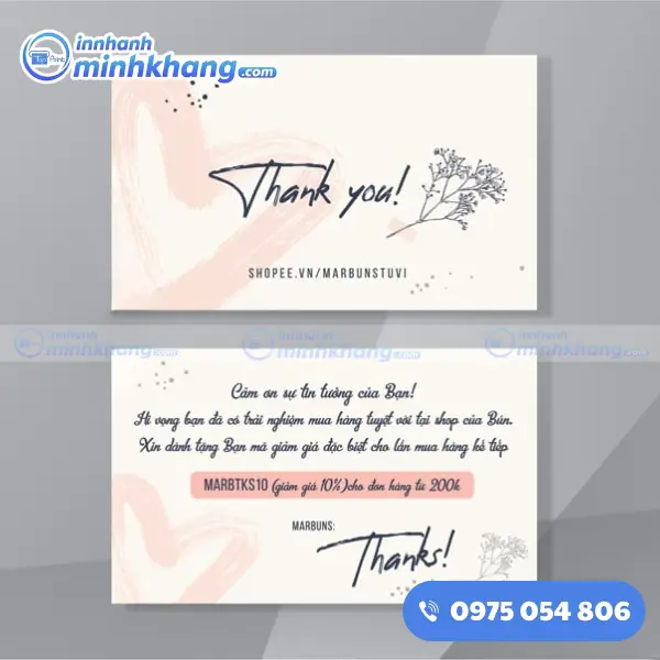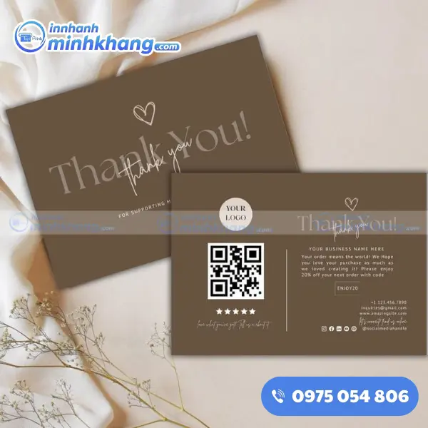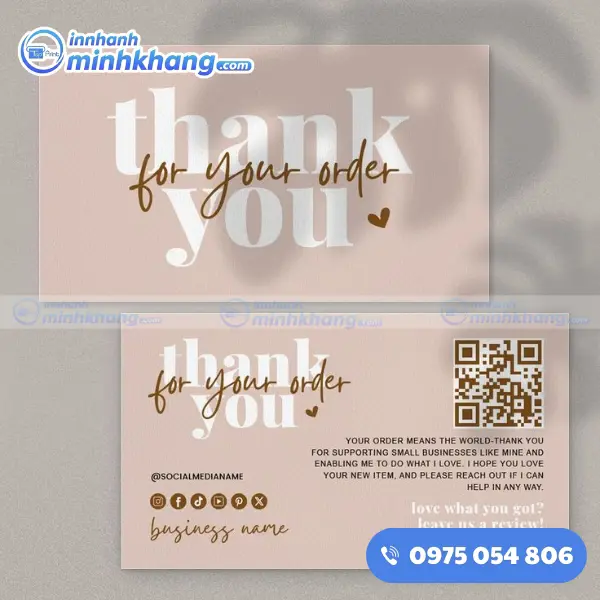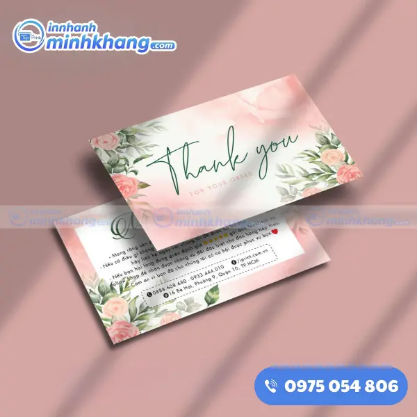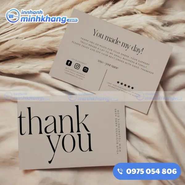 Một tấm name card cảm ơn tuy nhỏ bé nhưng lại mang trong mình sứ mệnh lớn lao: kết nối cảm xúc và khẳng định giá trị thương hiệu. Nếu bạn đang băn khoăn về ý tưởng thiết kế hay chưa biết lựa chọn chất liệu nào cho phù hợp, hãy liên hệ ngay với In Nhanh Minh Khang qua số hotline: 0975.054.806. Chúng tôi luôn sẵn sàng lắng nghe và mang đến cho bạn những giải pháp in ấn tối ưu nhất, giúp hành trình kinh doanh của bạn thêm phần thành công và rực rỡ!