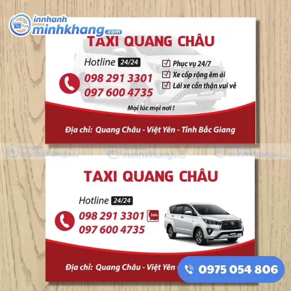 Một chiếc name card taxi được thiết kế chỉn chu không chỉ giúp khách hàng dễ ghi nhớ mà còn là công cụ marketing bền bỉ cho tài xế và hãng xe. Từ hình ảnh, màu sắc đến chất liệu in đều góp phần xây dựng sự chuyên nghiệp và tăng khả năng khách quay lại sử dụng dịch vụ. Nếu bạn đang cần in danh thiếp taxi đẹp, rõ thông tin, giá hợp lý và thời gian nhanh chóng, In Nhanh Minh Khang là địa chỉ đáng tin cậy. Liên hệ ngay hotline: 0975.054.806 để được tư vấn và hỗ trợ thiết kế – in ấn theo đúng nhu cầu thực tế.