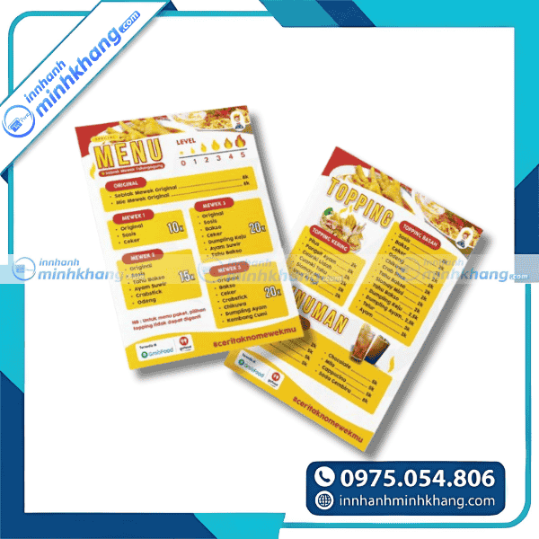 | A6 (10.5 × 14.8 cm) | 1 mặt hoặc 2 mặt | Menu mini, phát kèm đơn hàng giao tận nơi |