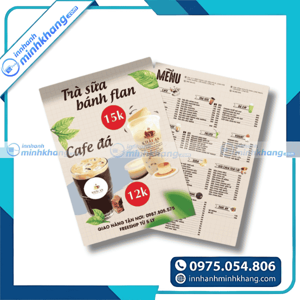 | A5 (14.8 × 21 cm) | 1 mặt hoặc 2 mặt | Phổ biến nhất – quán cà phê, trà sữa, quán ăn bình dân |