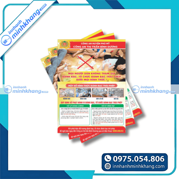 Tờ rơi tuyên truyền pháp luật là công cụ không thể thiếu trong mỗi chiến dịch phổ biến, giáo dục pháp luật của các cơ quan, tổ chức và cộng đồng. Hãy để In Nhanh Minh Khang đồng hành cùng bạn tạo ra những ấn phẩm tuyên truyền chuyên nghiệp, ấn tượng và lan tỏa hiệu quả nhất. Liên hệ ngay qua Hotline: 0975.054.806 để được tư vấn và báo giá miễn phí!